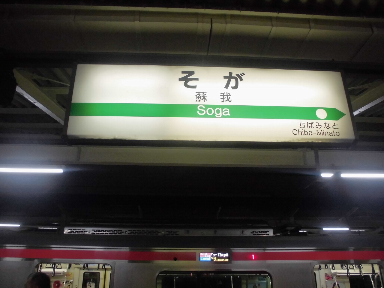 駅の看板。豪族の蘇我氏によってこの土地が開かれ、蘇我氏の部民の居住地だった事から蘇我と名付けられたという説あり