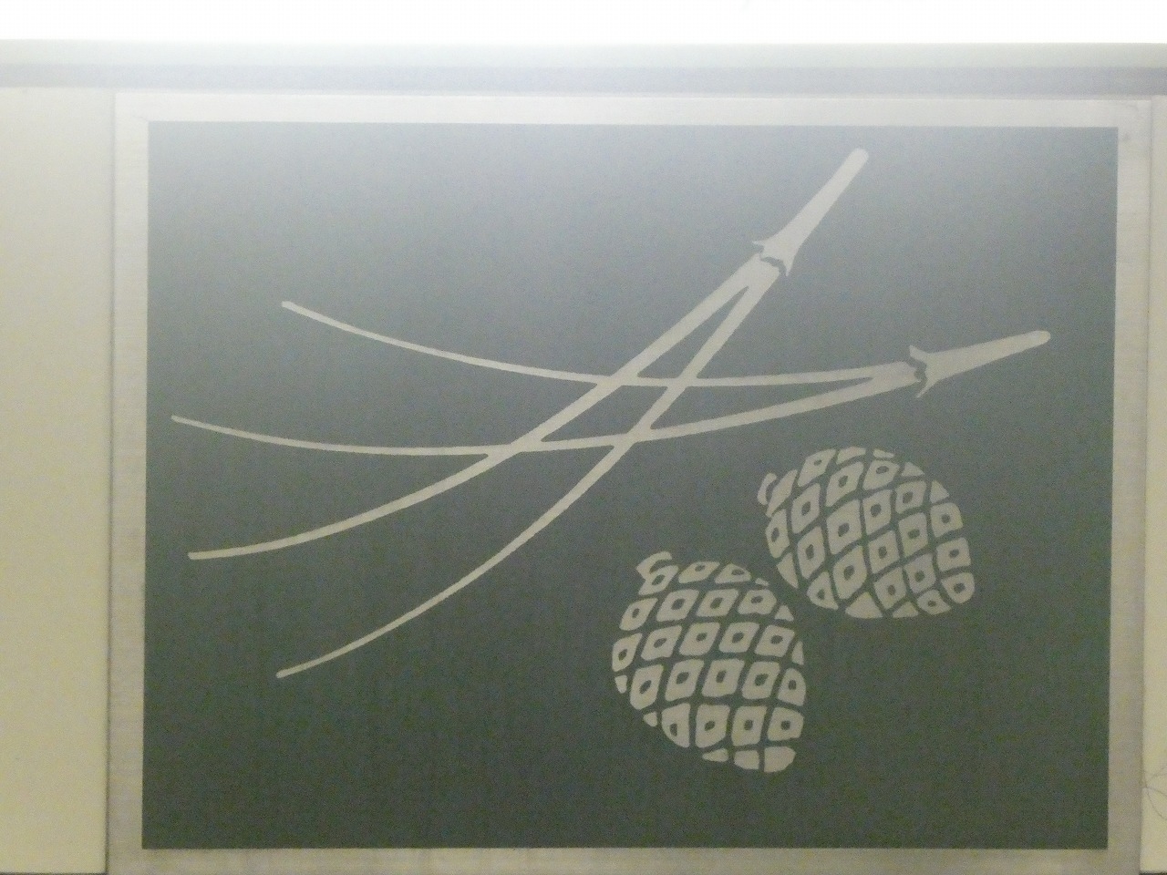 広告とイチョウの葉模様の壁。葛飾八幡宮の千本イチョウに基づくもの