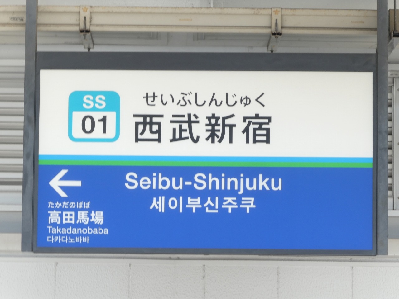 丸ノ内線駅名標。両駅とも新宿駅と地下で繋がっており徒歩移動が可能。新宿三丁目駅はともかく、西新宿駅はちょっと遠いかも