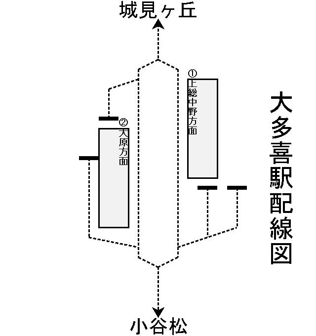 2面2線ホームで駅舎側1番線が下り(上総中野方面)ホーム、構内踏切を渡った先2番線が上り(大原方面)ホーム。上下線とも当駅止まりの列車が一部ある。
