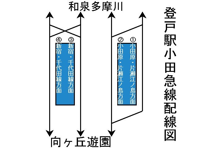 小田急線は2面4線ホーム。通勤急行とロマンスカーを除く電車が停車する。外側1・4番線が緩行線、内側2・3番線が急行線。