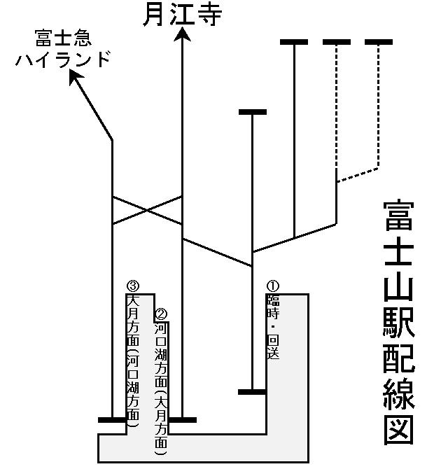 2面3線ホーム。スイッチバック式の頭端式ホームとなっており基本的に河口湖方面が2番線、大月方面が3番線を使用する。1番線は回送や臨時列車用として使う。ホーム有効長は1・2番線が4両、3番線が6両で中央本線に直通する5両編成以上の列車は行き先に関わらず3番線に発着する。
