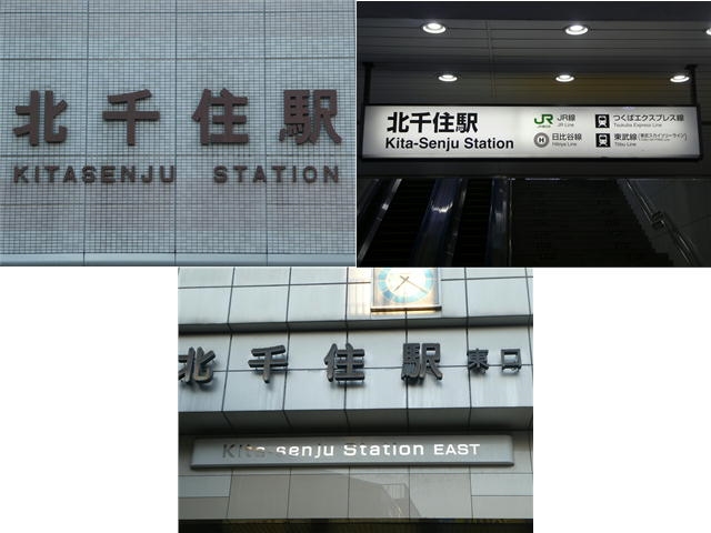 北千住駅の文字。右上のは東口から2階に上がる出入口にあるもの。千代田線は西口へ回って地下へどうぞ