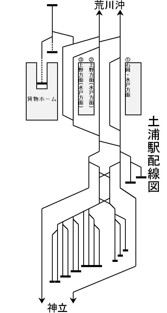 2面3線ホーム。日中の普通列車は上下線共当駅止まりとなり、上野方面からの列車は3番線、水戸方面からの列車は2番線に発着して対面乗り換えを行う。この際水戸方面の列車は5両編成で運行されている。またホーム有効長15両の駅は上野方面から見て当駅までで、当駅から水戸方面は10両以下でないと運行不可。
