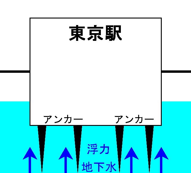 東京駅の総武線ホームは地下27m。建設当初の地下水位は地下35m、揚水規制の効果が現れると地下15mまで上昇した。すなわち総武線ホームは地下水に沈んでいることになる。