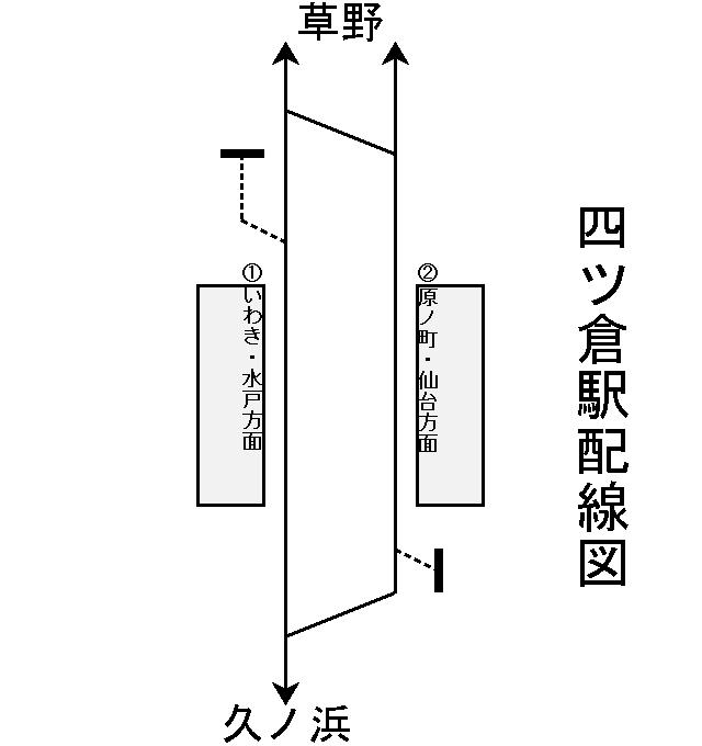 四ツ倉駅の文字。地名は「四倉」。「ツ」を駅名に入れたのは読み方を知らないと「よつくら」とは読みにくいため間に「ツ」を入れたとかなんとか
