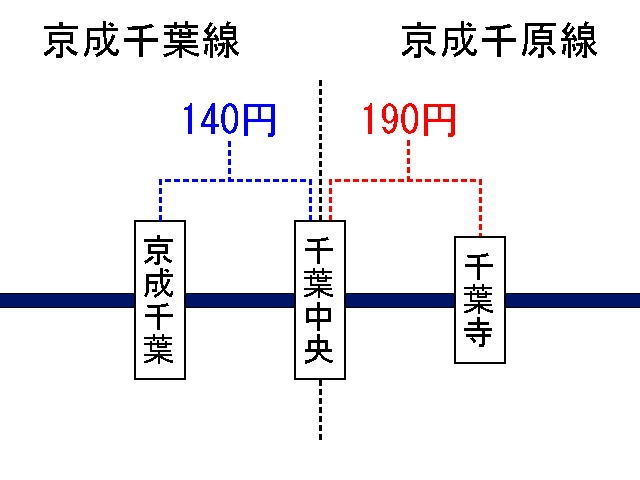千原線は京成電鉄の路線だが運賃計算が特殊で、千葉中央駅を境に一度キロ数を打ちきり千原線(千原線からは千葉線)の運賃を上乗せするため高水準な運賃となっている。千原線の前身だった千葉急行電鉄の運賃体系を京成電鉄がそのまま引き継いでいるため。