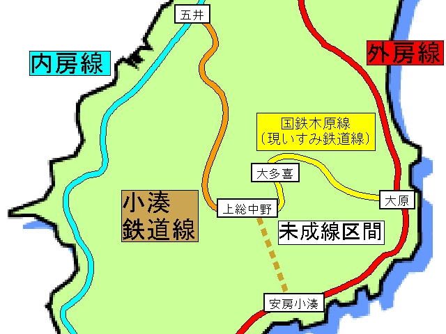 木原線(現いすみ鉄道)は「大原」〜「大多喜」間から延伸を繰り返し、のちに「上総中野」で小湊鉄道線と接続する。これで房総半島を横断する手段が出来上がった。