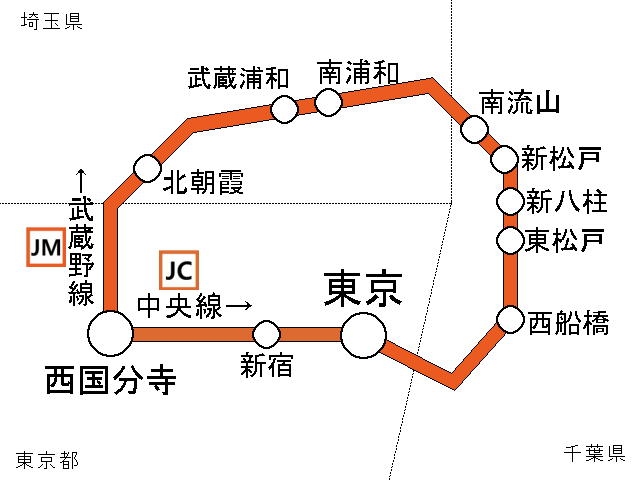 武蔵野線の乗り換え路線で東京行きがあるのは西国分寺駅の中央線だけ。そのため西国分寺駅だけ東京行きが2種類あるという事態が発生しているのだ。
