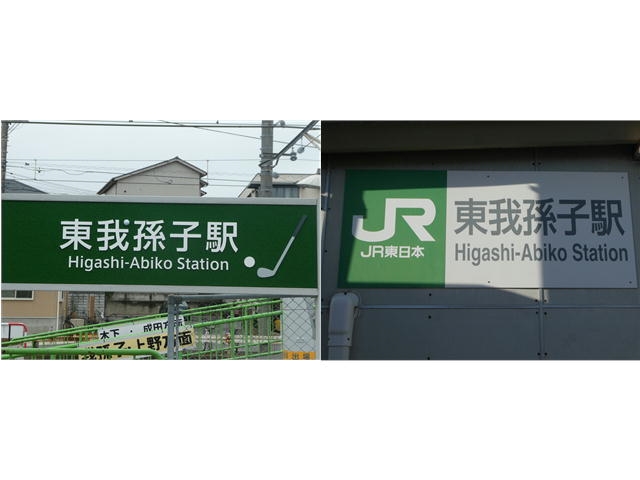 駅名標。我孫子市は成田線のさらに東の布佐駅まで広がっている。当駅は我孫子駅の東という意味なのだろう