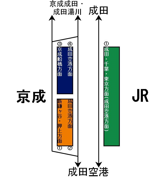 これは東京と成田空港を鉄道で結ぶために計画され、白紙に終わった成田新幹線の用地をJRと京成で分けあったからである。限られた用地で京成は2路線が乗り入れるため、一つのホームを2つに分断し停止位置をずらすことで2路線の駅を実現しているのだ。