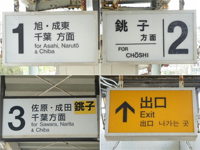 .jpg) 成田線の駅に見られる花がデザインされた駅名標。描かれている花は「さざんか」。銚子市の木である