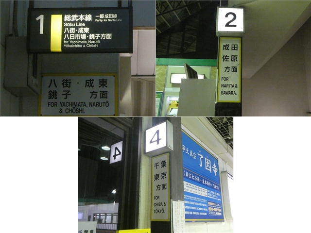 駅名標。当駅から下り方面は総武本線と成田線が分岐する。隣の駅の表記が枝分かれせずに酒々井・南酒々井と書かれている