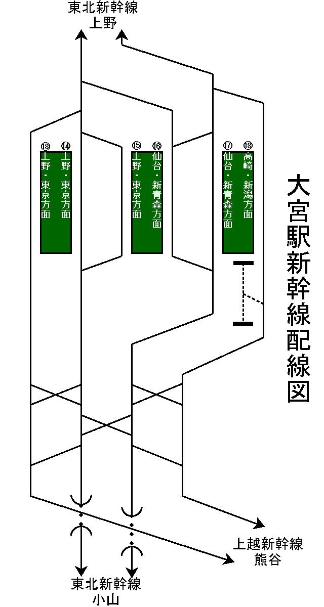 新幹線は大宮駅の西口側に高架ホームを持ち、全旅客列車が当駅に停車する主要駅。上越新幹線は路線上当駅を起点とし、東北新幹線から枝分かれするような形となっていて上越新幹線と北陸新幹線はそちらに向かっていく。