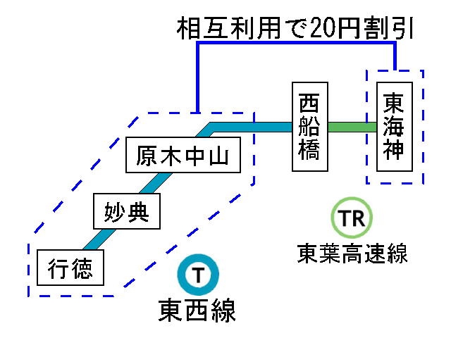 東葉高速線は運賃が高く、近距離でも東西線に直通すると東京メトロの運賃が上乗せされて高額となる。これを軽減するために当駅と東西線「原木中山」〜「行徳」間を利用すると20円割引される制度がある。