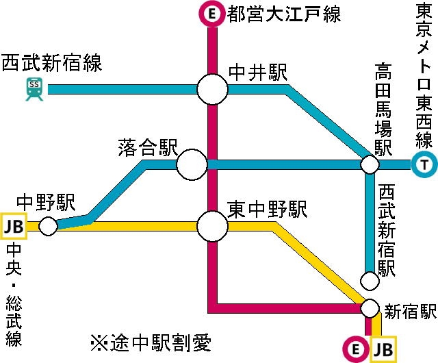 JR中央総武線(東中野駅)・都営大江戸線(東中野駅と中井駅)・西武新宿線(中井駅)はいずれも新宿駅を通る。西武新宿線に至っては新宿駅の他路線から遠い西武新宿駅でしかも終点。乗り換えしないと先に進めない。
