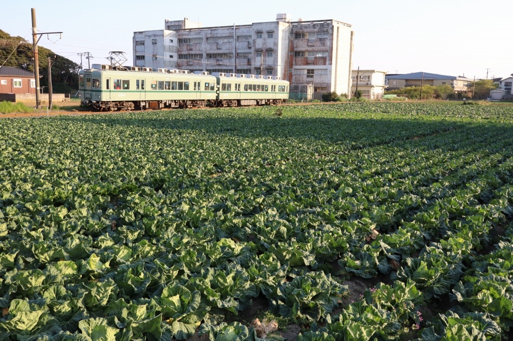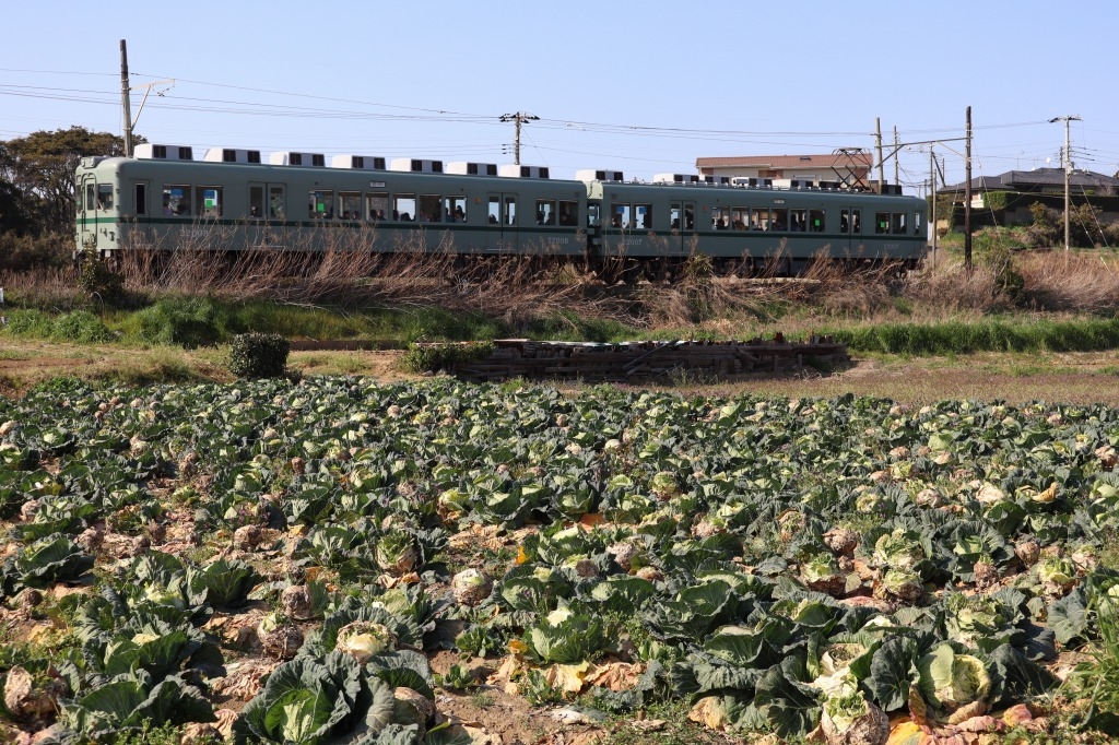 「犬吠」〜「外川」間のキャベツ畑。銚子市は日本有数の春キャベツの生産地。これからの収穫が楽しみである