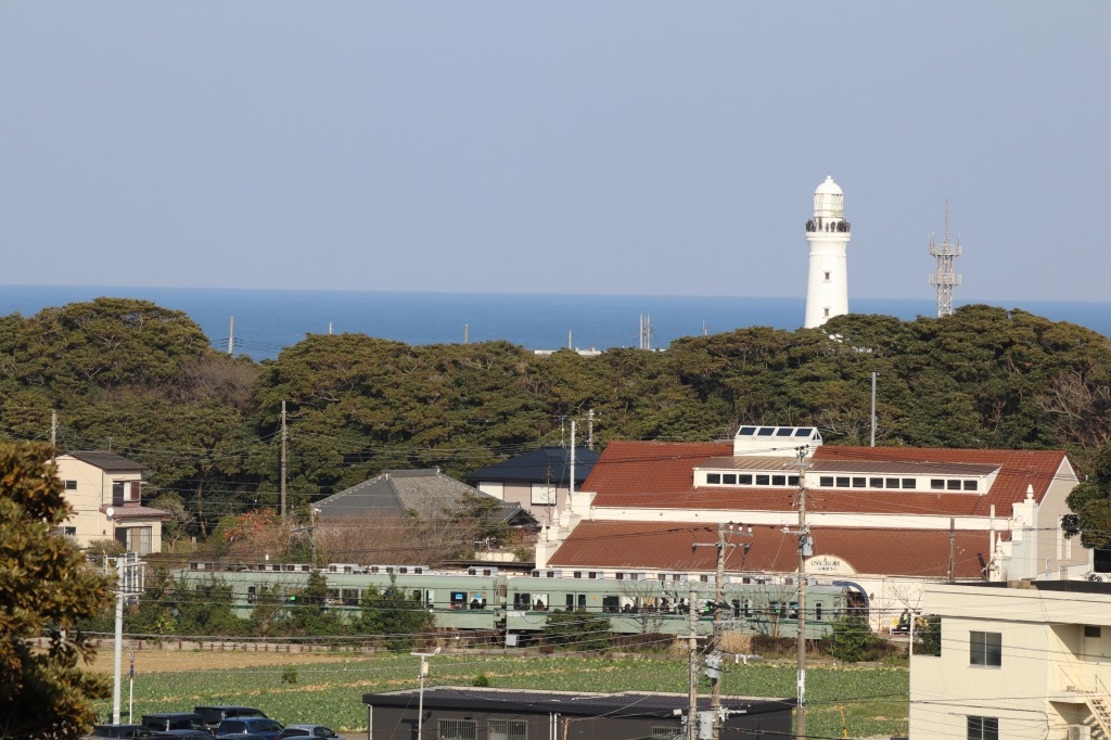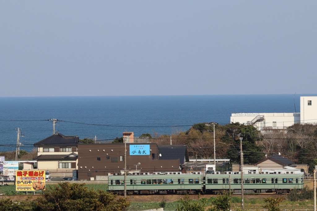 「犬吠」〜「外川」間、海をバックに走る。車窓から海は見えなくても、海はすぐそこ