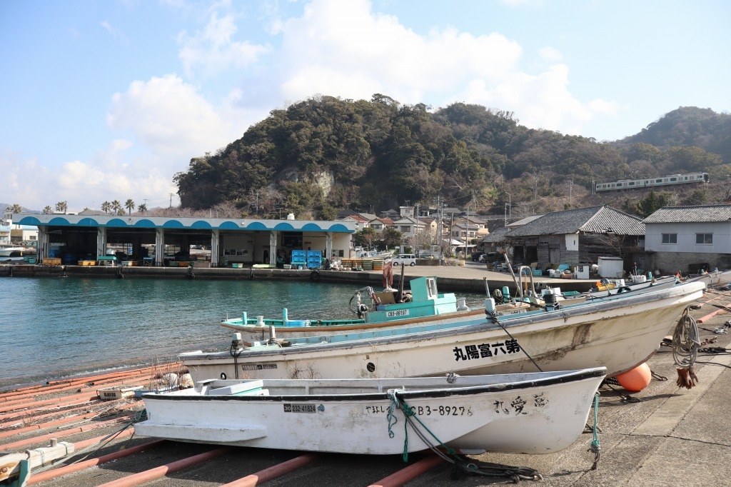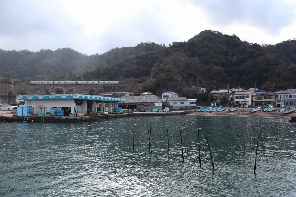 「岩井」〜「富浦」間、小浦漁港のそばを通る4両編成