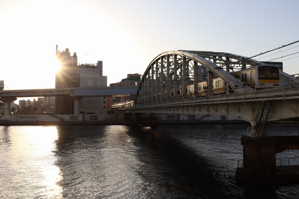 両国駅西口から隅田川に向かって歩き、両国橋に向かう。隅田川沿いは遊歩道が整備されているのでそちらに降りて隅田川を渡る総武線を撮る。スカイツリーがバックに入るため東京らしい一枚となる。