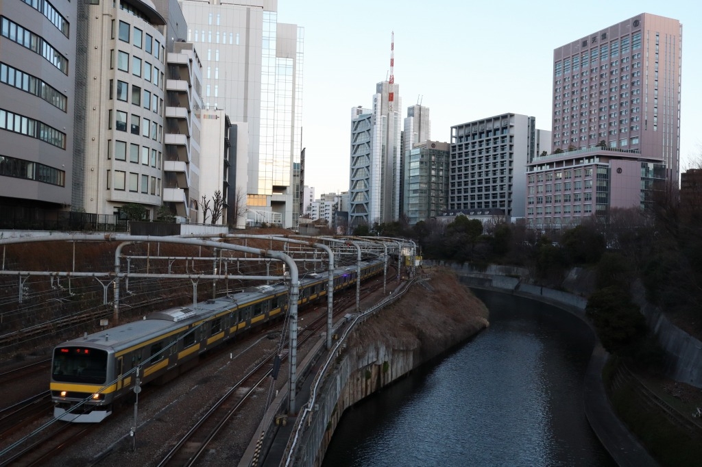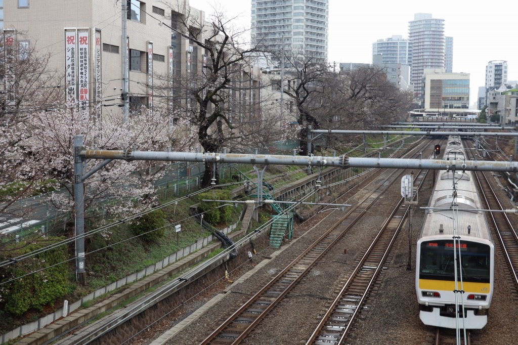 JR市ケ谷駅から皇居の外堀に架かる市ケ谷橋を渡り、外堀通りに出る。そこは春になると外堀沿いに桜の花が目一杯に咲く桜の名所であり、外堀に沿って走る電車と桜を交えて撮影できる。桜の花の間にどう電車を入れるかがポイントとなる。