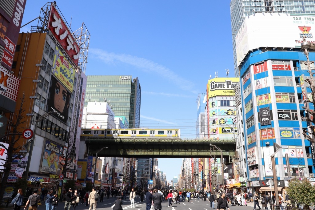 歩行者天国が実施された秋葉原電気街の中央通りから撮影。歩行者天国の時間帯は毎週日曜日の日中。世界有数の電気街を貫く中央・総武線(総武本線支線)も秋葉原電気街の景観を構成する一つの要素かもしれない。