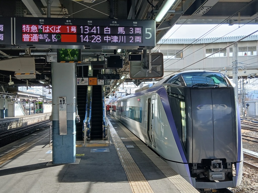 大糸線に乗り入れる唯一の特急あずさ。南小谷行きは2023年現在は新宿始発の朝1本あずさ5号のみ。松本駅で後3両(1〜3号車)を切り離し大糸線内は9両で運行される。大糸線内の特急停車駅はホーム有効長が9両なためである。南小谷駅には1番線に着き、帰りのあずさ46号新宿行きに備えてそのまま留置される。