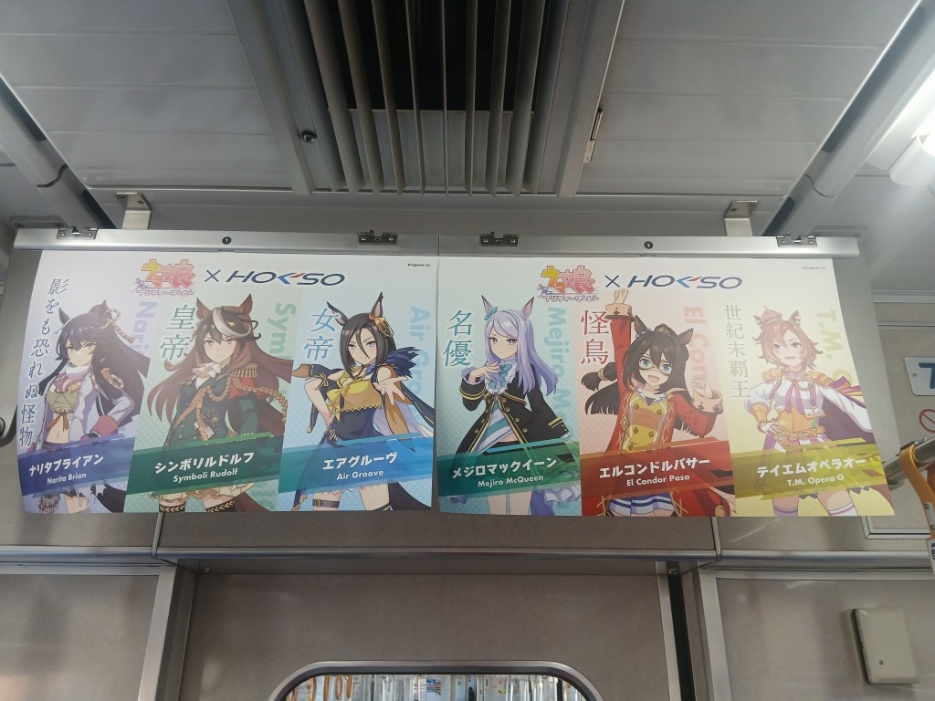 ウマ娘コラボ広告ジャックトレインの車内広告。123名のウマ娘が車内広告スペースをジャック