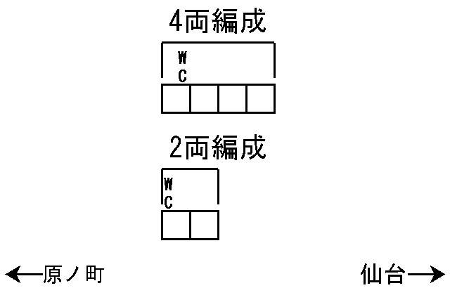 東北本線の支線にあたる利府線の行き先。基本的に東北本線の分岐点である岩切駅か仙台駅始発だが朝1本に限り原ノ町始発がある。逆に利府始発原ノ町行きもある。原ノ町駅から利府駅まで約1時間15分。