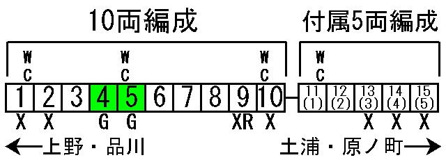 4〜5号車はグリーン車。2021年10月現在「品川」〜「高萩」間で利用できる
