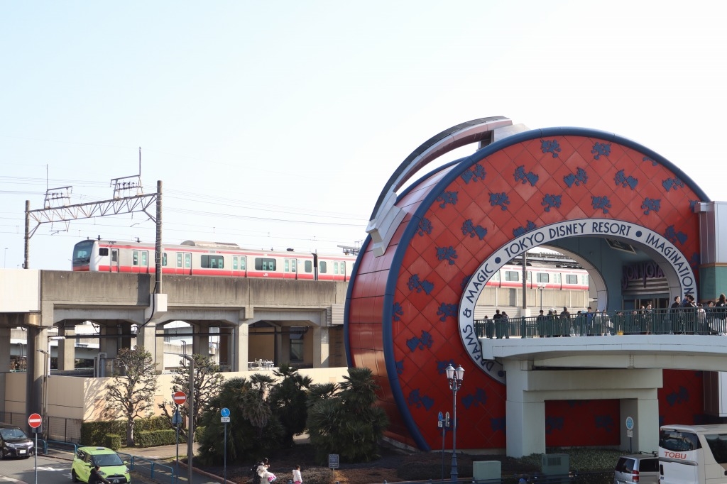 特徴的な外観は帽子箱である。歩行者専用デッキはディズニーランドのゲストで人通りが絶えないため邪魔にならない所から撮る。