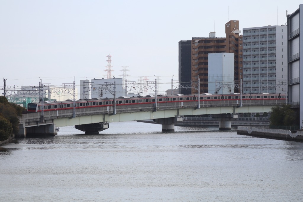 潮見駅から約1km。歩行者専用橋のしおかぜ橋から汐見橋梁を渡る京葉線を撮影する。撮影地としてはかなりのキャパがありそう。汐見運河を手前に京葉線がちょうど地下区間から地上へ、あるいはその逆となる場所。京葉線の撮影地だが10両編成のE233系が収まらない。