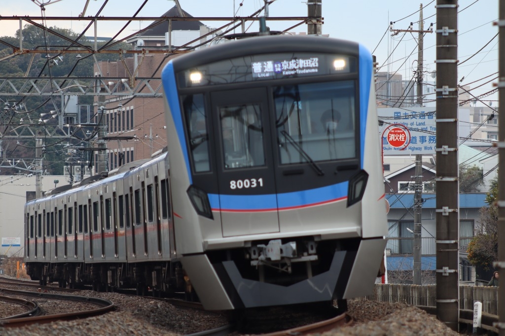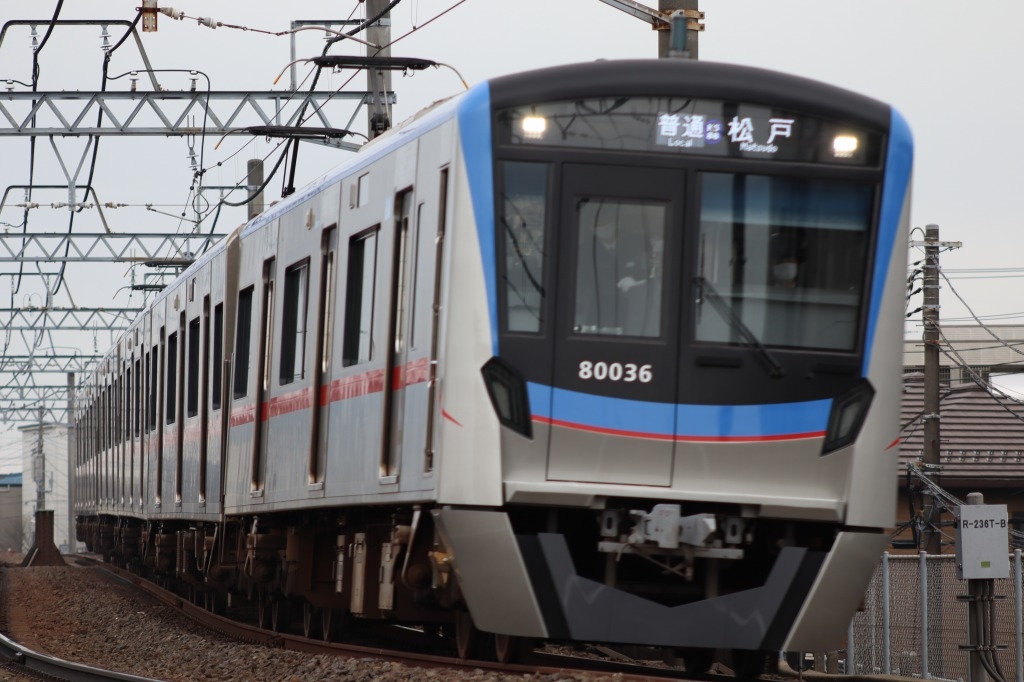 「松戸」〜「上本郷」間の直線を走る京成カラーの80000形