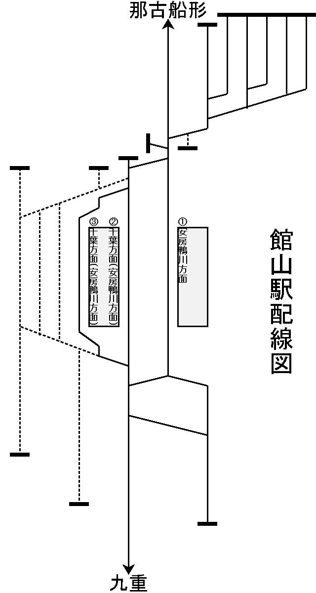 2面3線ホーム。1番線は下り、2・3番線は上下兼用。主に上り(千葉方面)は1番線、下り(安房鴨川方面)は2番線を使用。ホーム有効長は11両分あり、かつて総武快速線からの特別快速館山行きが発着していた。那古船形寄りに6本、九重寄りに1本留置線があり普通列車の夜間留置と新宿さざなみの留置に使用されている。