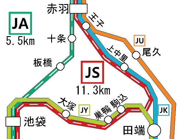 いかがだろうか。「横浜」〜「品川」間はともかく、「池袋」〜「赤羽」間に対しては湘南新宿ラインはどうしてこうなったと言わんばかりに遠回りしている。