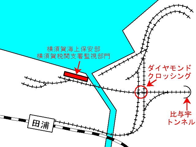 画像から見て手前の線路が田浦駅へ、奥の分岐する線路がそれぞれ港に続いているようだ。