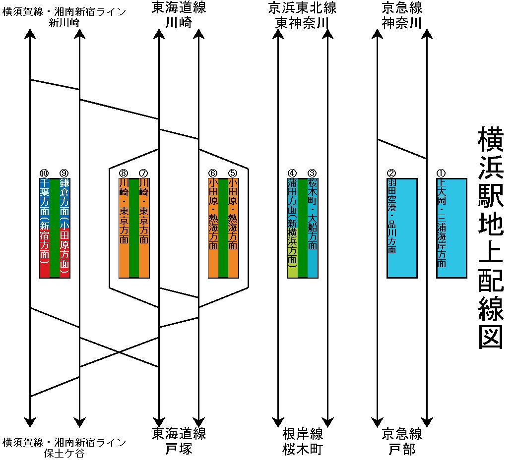 京急線で最大の利用客を誇る駅。京急線中央改札の中にJR線乗り換え改札が設置されている。横浜駅地上ホームの1・2番線は京急線に充てられ、3番線以降はJR線へ続く。