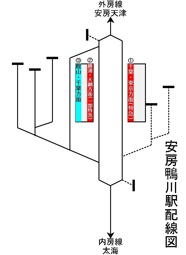 外房線・内房線の終着駅。そのため当駅から発車する列車は全て上りとなる。両路線は繋がっており、2021年3月13日のダイヤ改正から房総末端区間に投入されたE131系のワンマン普通列車が直通運転を行っている。