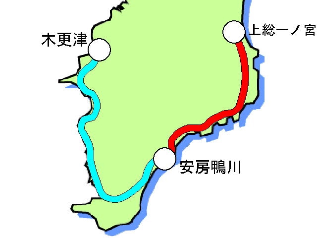 千葉駅から外房線に乗ると当駅まで約93km、同じく内房線に乗ると約123kmの距離。実際の外房線周りと内房線周りの中間は内房線の南三原と和田浦辺りになる。千葉方面から当駅までは外房線経由の方が早い上にこちらは特急も走っている。