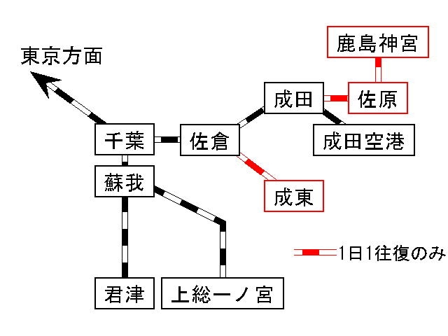 「東京」〜「千葉」間は快速運転、「千葉」から先は外房線・内房線・総武本線・成田線・鹿島線と5路線に直通し、各方面にのびる通勤路線としての役割を担っています。直通先は成田線成田空港方面が最も多く、特急も運行される成田空港へのアクセス路線としての顔を持ちます。